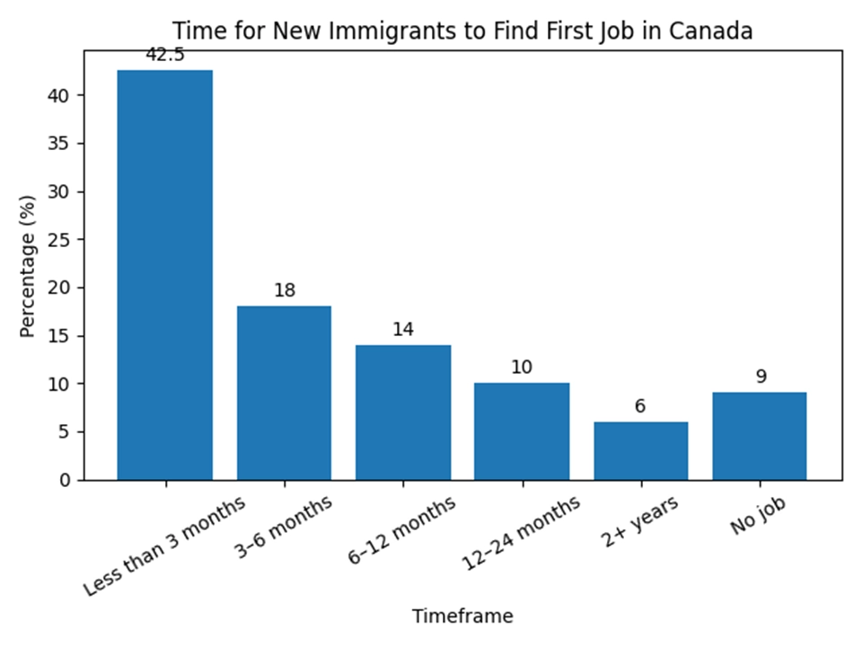 Environ 42,5 % des immigrants récents qui n’avaient pas d’emploi avant leur arrivée ont trouvé du travail dans les trois mois. Cependant, les délais varient considérablement et certains nouveaux arrivants mettent six mois ou plus en fonction de leur domaine, de leur expérience et de leur stratégie de recherche d’emploi.